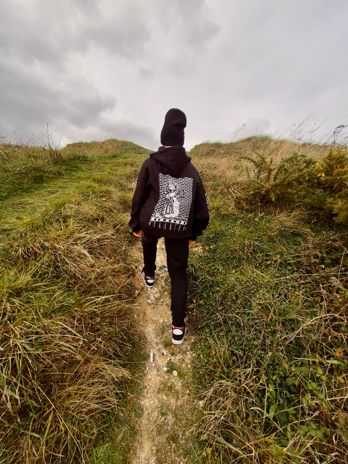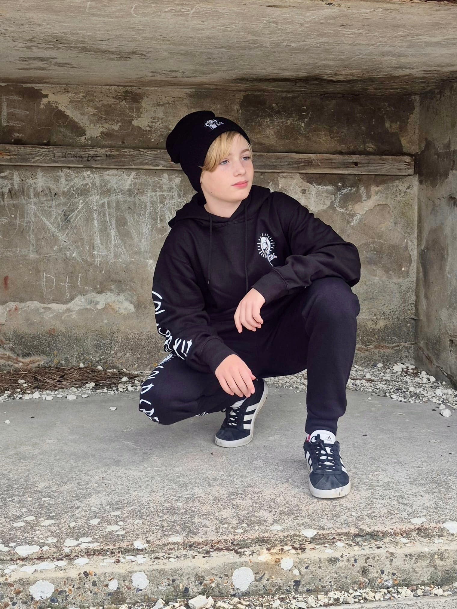 C.O.L.D. Crew Kids premium medium-weight hoodie in black with OG Crew Kitty logo on the front, pool carver kitty deck graphic print on the back, and C.O.L.D. Crew Kids Text down the right sleeve.