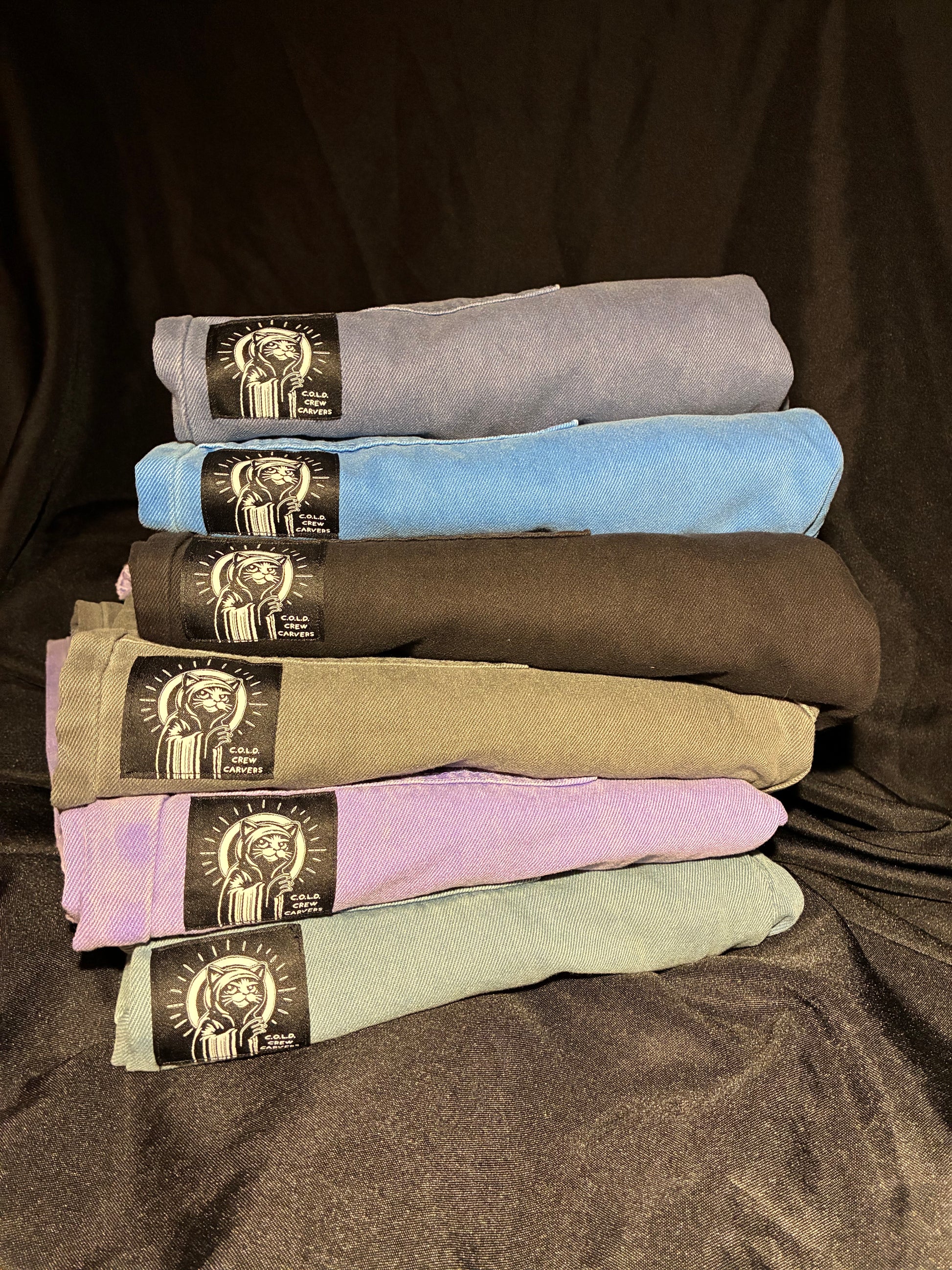 Knotted straps—no buttons, snaps, or zippers. Two front pockets and our original embroidered C.O.L.D. kitty logo, right front leg—vintage 80s style.